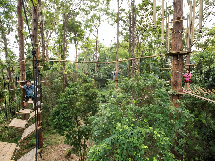 這是一款沉浸式森林主題室外拓展游樂設(shè)備,以天然林木為支撐,構(gòu)建出多層錯(cuò)落的木質(zhì)棧道與鋼索挑戰(zhàn)關(guān)卡,讓挑戰(zhàn)者在茂密雨林的高空穿梭。主體采用防腐實(shí)木打造平臺(tái)與棧道,搭配高強(qiáng)度鋼索與金屬連接件固定,既保障了結(jié)構(gòu)穩(wěn)固與游玩安全,又最大程度保留了雨林的原生風(fēng)貌。設(shè)備集高空行走、平衡挑戰(zhàn)、飛索穿越于一體,適用于熱帶雨林景區(qū)、戶外營地、研學(xué)基地等場(chǎng)景,讓挑戰(zhàn)者在與自然的親密接觸中鍛煉平衡感、勇氣與探索精神,沉浸式感受雨林探險(xiǎn)的刺激與壯闊。