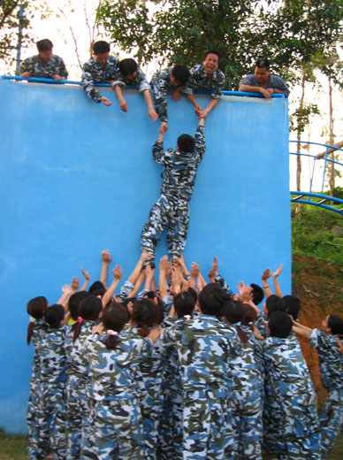 課程安排:信任背摔、罐頭鞋、逃生墻、穿越電網(wǎng)、迷宮、斷橋、盲人方陣、有軌電車、共展宏圖、定向越野、神奇的大腦、巧解繩結(jié)、婚宴上的賓客、聽(tīng)與說(shuō)、小問(wèn)題難倒你、形象刺激法、微軟的智力題、挑竿。