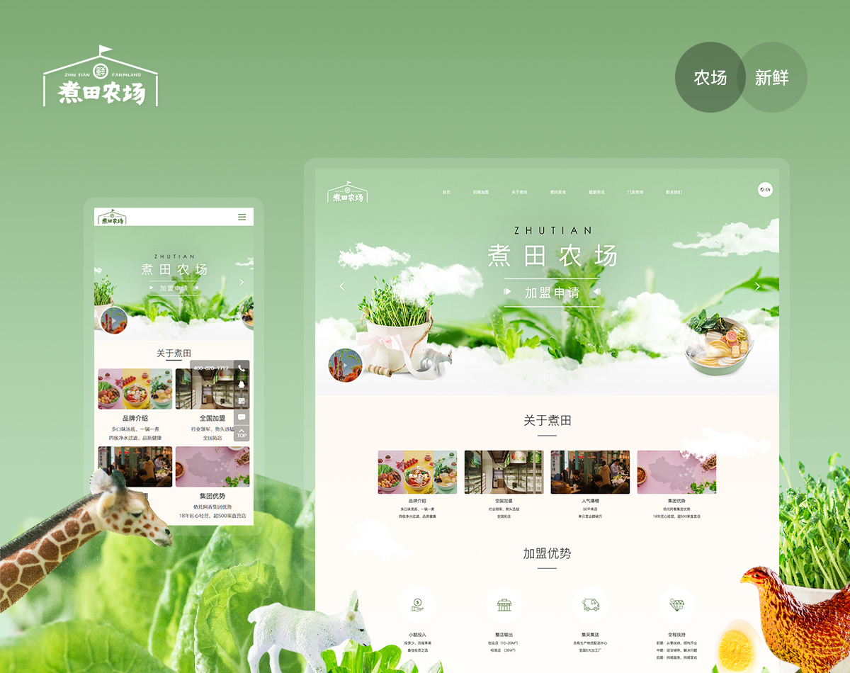 以“農場”“新鮮”為創意設計靈感,將農產品融入網頁背景中;以沉浸式的瀏覽體驗,將煮田農場的產品特色、服務理念及加盟條件娓娓道來,為瀏覽者帶來舒適、溫馨感,同時也完美闡釋煮田農場的網絡形象。