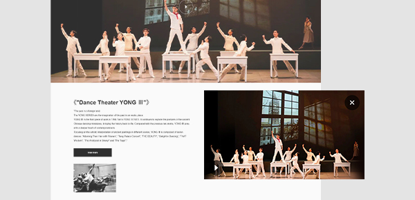 網站實現視頻在線播放功能,訪問者可在線觀看舞蹈視頻,下拉進入詳情頁時,視頻會以小窗口播放形式,懸浮在頁面上方,使得用戶瀏覽詳情介紹信息時,也可同時觀看視頻,適配了用戶的觀感體驗。