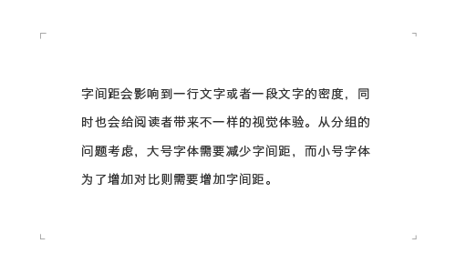 字間距會(huì)影響到一行文字或者一段文字的密度,同時(shí)也會(huì)給閱讀者帶來(lái)不一樣的視覺體驗(yàn)。從分組的問題考慮,大號(hào)字體需要減少字間距,而小號(hào)字體為了增加對(duì)比則需要增加字間距。